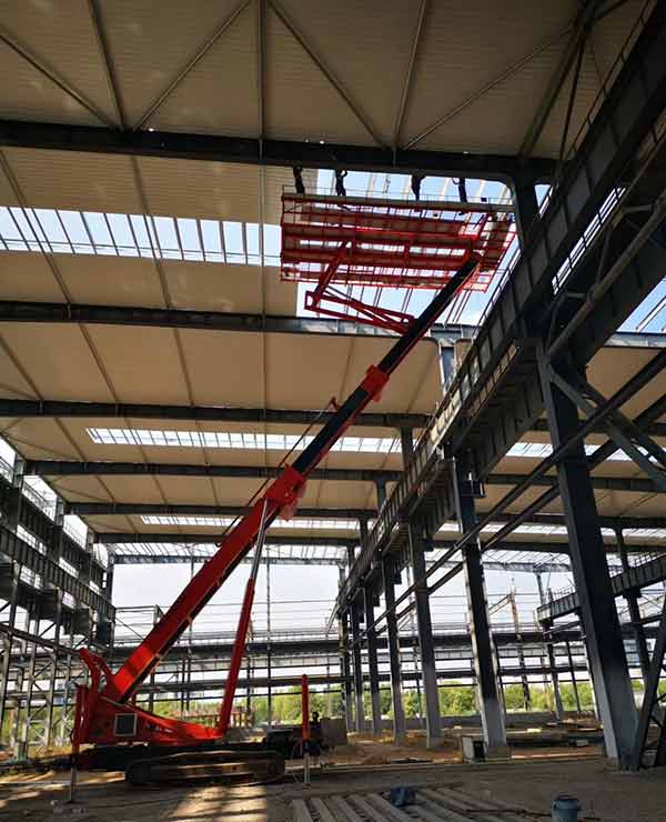 4、使用高空升降平臺(tái)搭建鋼結(jié)構(gòu)可以節(jié)省很多麻煩,可以超長(zhǎng)度的生產(chǎn)彩鋼瓦不需要彩鋼瓦拼接,能有效避免房頂漏水現(xiàn)象;